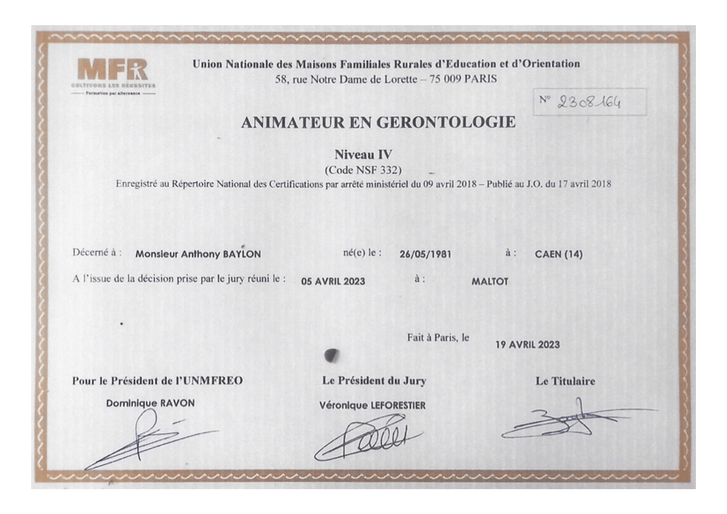 En 2023, j’ai eu le plaisir d’obtenir mon diplôme de animateur en gérontologie, une formation qui m’a permis d’acquérir toutes les compétences nécessaires pour accompagner efficacement les personnes âgées et dépendantes dans leur quotidien.
