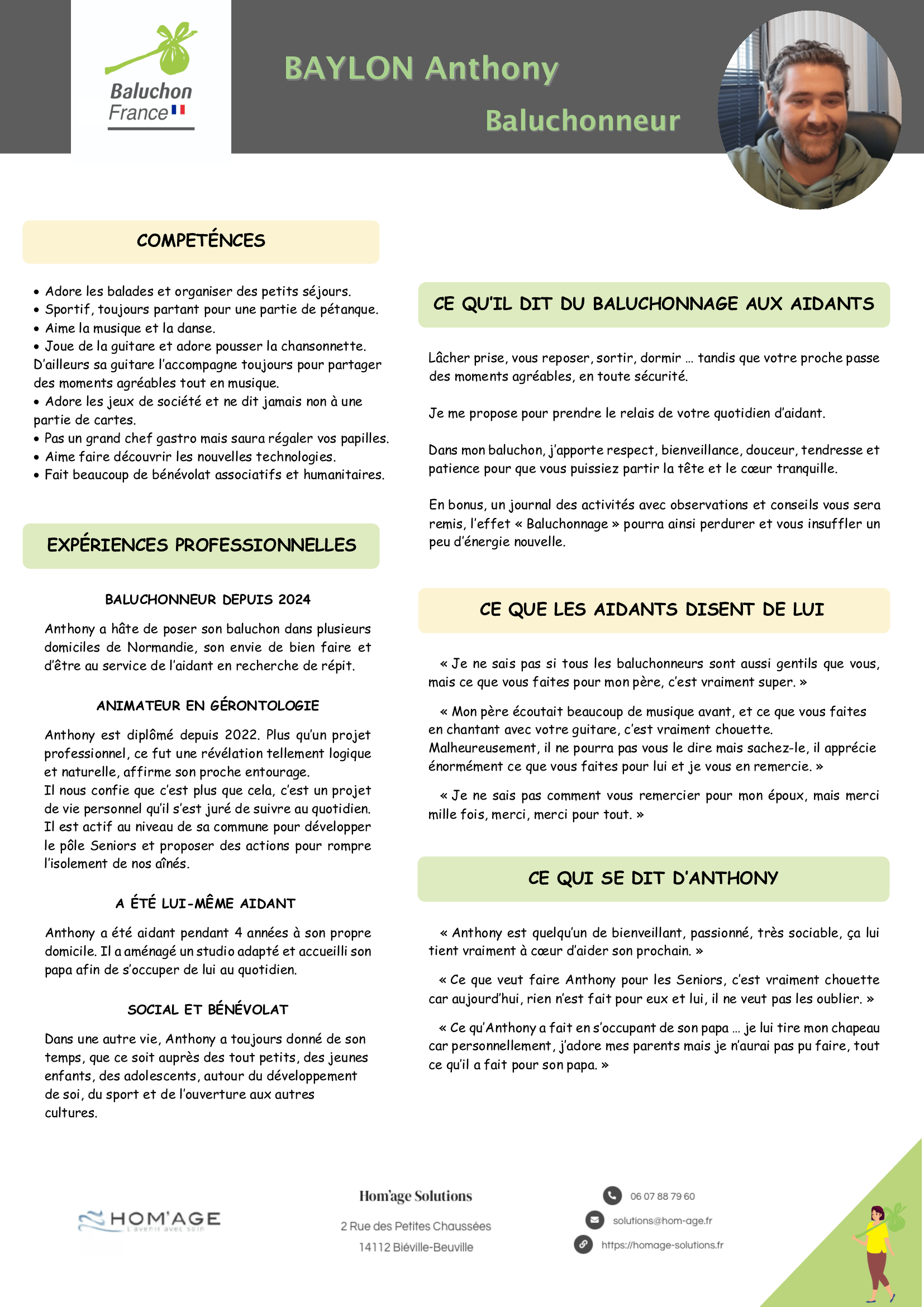 Être baluchonneur, c’est avant tout savoir organiser et préparer les soins et le matériel nécessaires au bien-être des seniors, tout en respectant leurs habitudes et leur confort. Ce diplôme atteste de ma capacité à intervenir de manière professionnelle et sécurisée, que ce soit pour l’aide aux repas, l’hygiène, les déplacements ou l’animation d’activités adaptées.